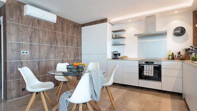 Die Ferienwohnung verfügt über 2 Schlafzimmer und eine Küche, die mit einem Kühlschrank und einem Geschirrspüler ausgestattet ist. Ein Badezimmer mit Dusche, Haartrockner sowie eine Waschmaschine sind ebenfalls vorhanden. Handtücher und Bettwäsche werden bereitgestellt.