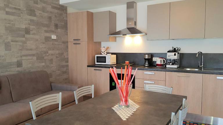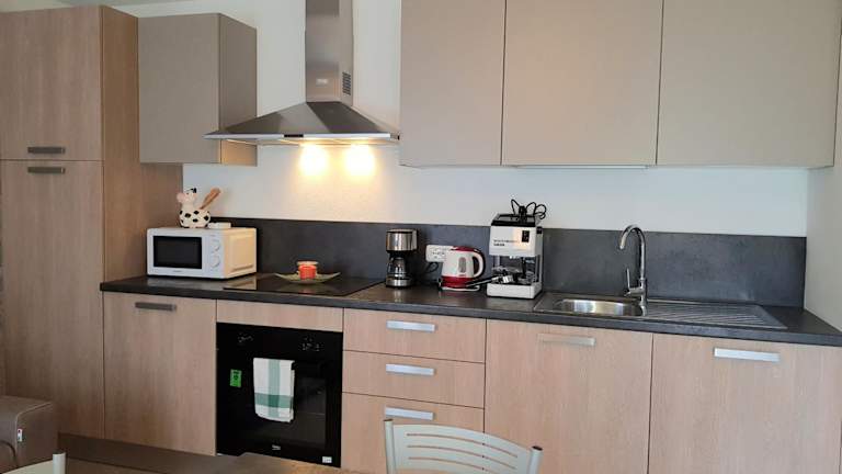 Die Ferienwohnung verfügt über 2 Schlafzimmer, ein Wohnzimmer mit Flachbild-TV, eine gut ausgestattete Küche mit Kühlschrank und Geschirrspüler sowie ein Badezimmer mit Dusche. Handtücher und Bettwäsche werden bereitgestellt, und eine Veranda/Patio bietet einen Blick auf die Stadt.