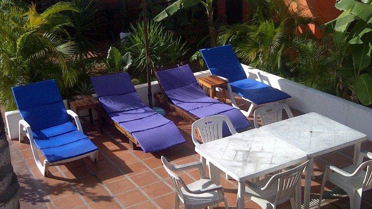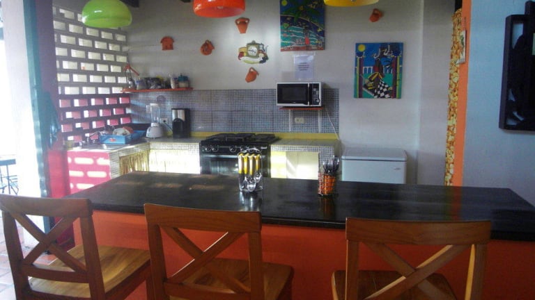 Das Hotel bietet eine große offene Gemeinschaftsküche an. Auf der Terasse finden ca. 20 Leute platzt.