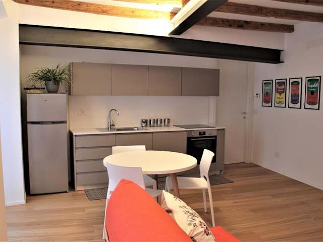 Die Ferienwohnung umfasst ein Schlafzimmer und ein Wohnzimmer. Die Küche ist voll ausgestattet und bietet alles Notwendige für den Selbstversorger. Das Badezimmer verfügt über eine Dusche und ein Bidet. Handtücher und Bettwäsche werden bereitgestellt.