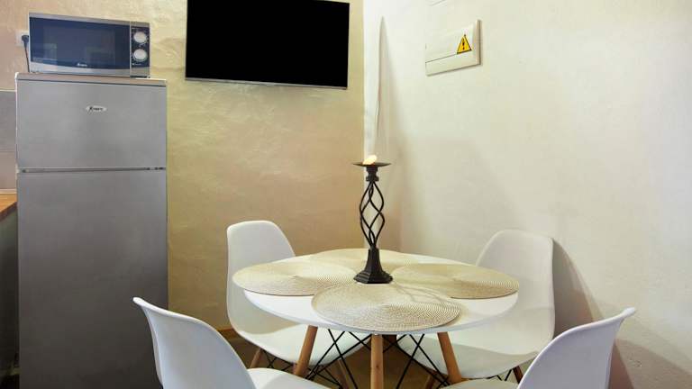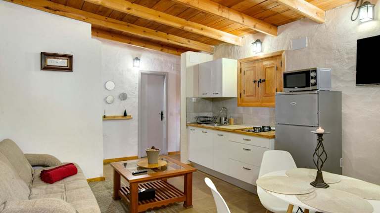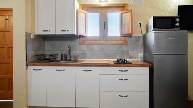 Die Villa verfügt über zwei Schlafzimmer und ein Badezimmer sowie eine voll ausgestattete Küche. Zur Ausstattung gehören Bettwäsche, Handtücher, ein TV mit Kabelkanälen und eine Terrasse mit Blick auf die Berge.