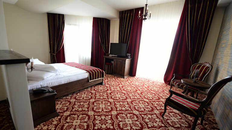 Die Zimmer im Castel Transilvania sind komfortabel und im mittelalterlichen Stil eingerichtet. Sie verfügen über einen Kamin und eine dunkelbraune und rote Einrichtung. Zur Ausstattung gehören eine Klimaanlage, ein Flachbild-Sat-TV, ein Sofa, ein Sitzbereich und ein Schreibtisch. Jedes Zimmer hat ein eigenes Bad und einige bieten auch einen Balkon oder eine Terrasse zum Entspannen.