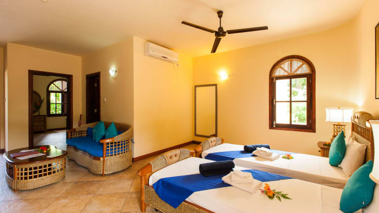 Das Castello Beach Hotel ist ein idyllisches Hotel direkt am Strand von Anse Kerlan. Hier können Sie einen entspannten Urlaub in tropischer Umgebung genießen und den atemberaubenden Blick auf den Indischen Ozean und die Nachbarinseln Cousin und Cousine erleben. Das Hotel bietet komfortable Suiten mit modernem Interieur und einem eigenen Balkon. Entspannen Sie am Pool oder lassen Sie sich im Massagepavillon verwöhnen. Das Restaurant des Hotels verwöhnt Sie mit köstlichen Speisen und einem traumhaften Blick auf den Sonnenuntergang. Das Hotel bietet auch Aktivitäten für Kinder und kostenfreies WLAN in allen Bereichen.