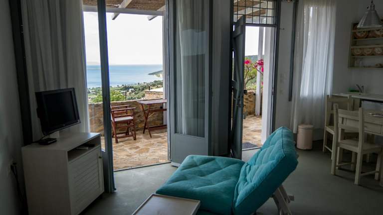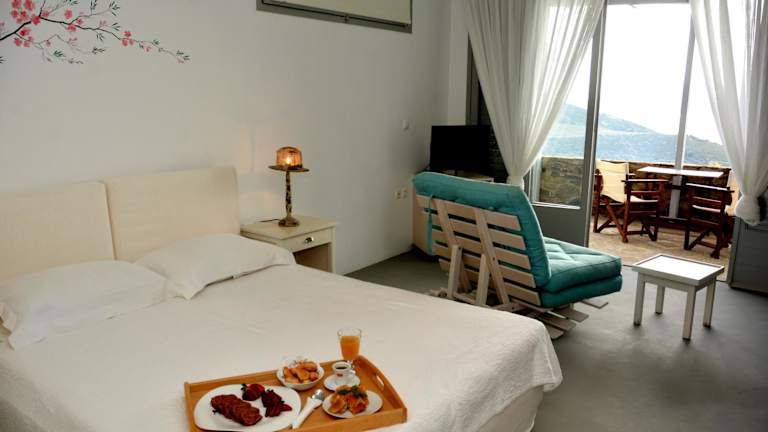 Die Studios im Celini Suites Hotel sind geschmackvoll eingerichtet und bieten einen herrlichen Blick auf den Golf von Euböa. Die Unterkünfte sind mit hochwertigen Coco-Mat-Matratzen, einer Küchenzeile, einem kleinen Kühlschrank und einem Esstisch ausgestattet. Ein Flachbild-TV, Bademäntel und ein Haartrockner gehören ebenfalls zur Ausstattung. Jedes Studio verfügt zudem über einen möblierten Balkon.