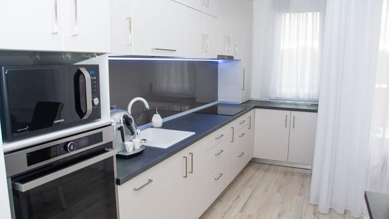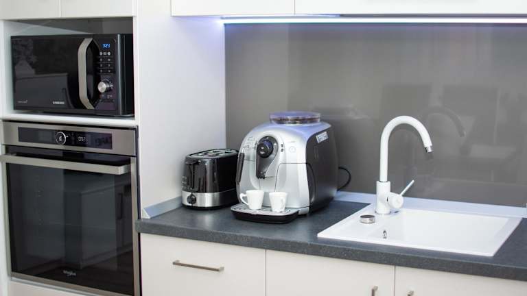 Die Ferienwohnung umfasst 1 Schlafzimmer, ein Wohnzimmer sowie eine voll ausgestattete Küche mit Kühlschrank und Kaffeemaschine. Es gibt ein Badezimmer mit Dusche und Haartrockner. Handtücher und Bettwäsche werden bereitgestellt.