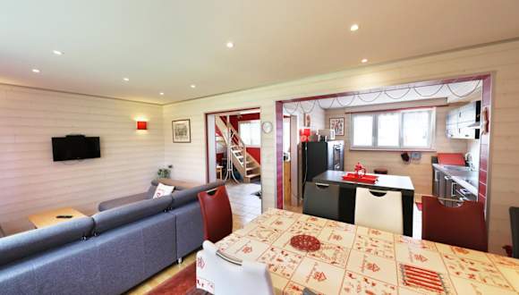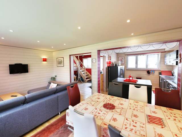 Das Chalet en Couleurs erstreckt sich über 2 Etagen und bietet ausreichend Platz für bis zu 8 Personen. Es verfügt über eine voll ausgestattete Küche mit einem Essbereich, in dem Sie Ihre Mahlzeiten zubereiten und genießen können. Das gemütliche Wohnzimmer ist mit einem Esstisch und einem Wohnbereich mit einem TV ausgestattet. Es gibt insgesamt 4 Schlafzimmer und 2 Bäder, die für Komfort und Privatsphäre sorgen. Der möblierte Garten lädt zum Entspannen ein und bietet Sonnenliegen sowie Grillmöglichkeiten für gesellige Abende im Freien.