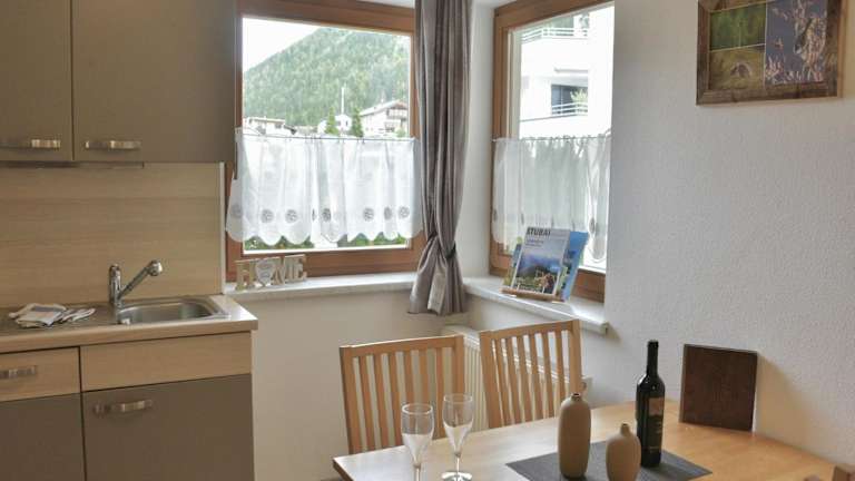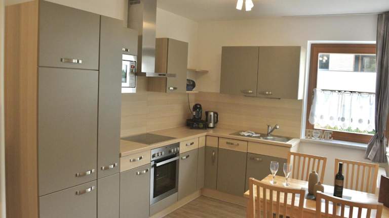 Die Küche ist vollständig ausgestattet und beinhaltet einen Kühlschrank sowie einen Essbereich, um die Zubereitung und den Genuss von Mahlzeiten zu ermöglichen.
