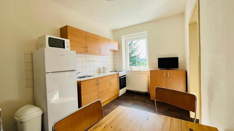 Eine gut ausgestattete Küche mit einem Kühlschrank und einem Geschirrspüler steht zur Verfügung, um Selbstverpflegung zu ermöglichen.