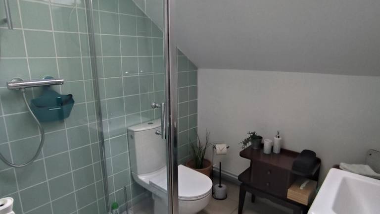 In jeder Wohneinheit der Chambres d'Hôtes Montjouan befindet sich ein eigenes Badezimmer mit Dusche, kostenlosen Pflegeprodukten, einem Haartrockner und Bademänteln.
