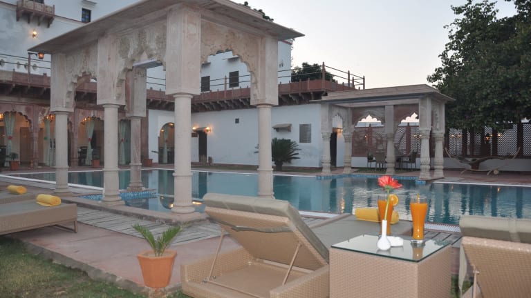 Das Chandra Mahal Haveli in Bharatpur ist eine denkmalgeschützte Unterkunft, die mit ihrem Außenpool und dem 24-Stunden-Rezeptionsservice für Komfort und Entspannung sorgt. Die klimatisierten Zimmer sind modern ausgestattet und verfügen über Annehmlichkeiten wie Flachbild-Sat-TV, Sitzecke und Balkon. Das Hotel bietet zudem einen schönen Garten, eine Terrasse und praktische Einrichtungen wie einen Tourenschalter und einen Parkplatz. Das hauseigene Restaurant Peharsi Andaaz verwöhnt Sie mit einer Vielfalt an indischen, regionalen und kontinentalen Gerichten. Genießen Sie Ihre Mahlzeiten auch ganz bequem auf Ihrem Zimmer mit dem Zimmerservice.
