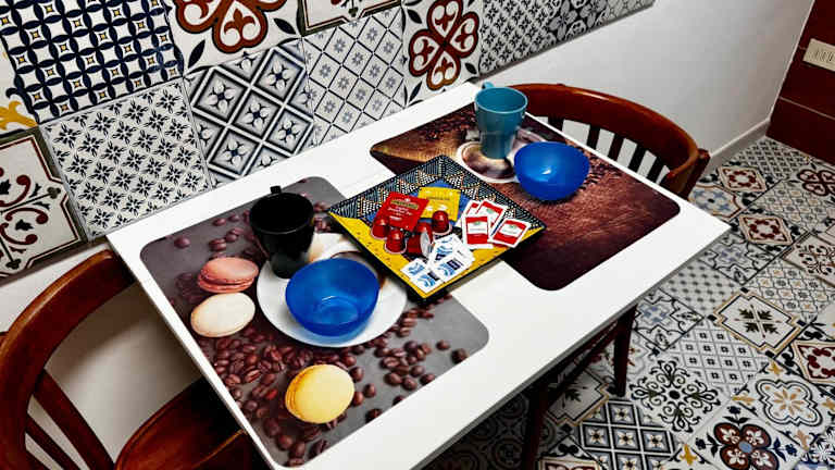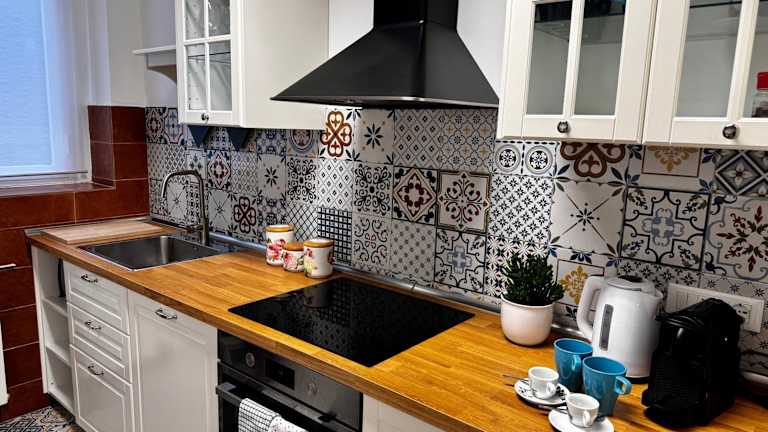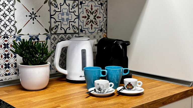 Die Ferienwohnung verfügt über eine komplett ausgestattete Küche mit Kühlschrank, Geschirrspüler, Ofen sowie Kaffeemaschine und Wasserkocher, was Selbstverpflegung ermöglicht.