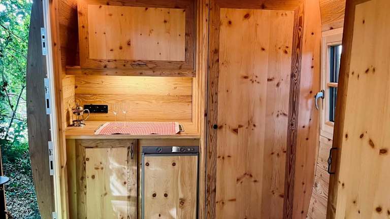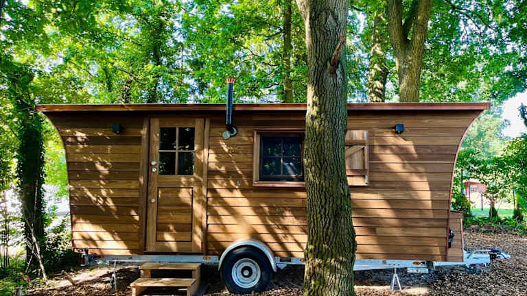 Das Tiny House umfasst ein separates Schlafzimmer, eine voll ausgestattete Küchenzeile mit Kühlschrank und Herdplatte sowie ein Badezimmer. Zudem verfügt die Unterkunft über eine Terrasse und kostenloses Privatparkplatz.