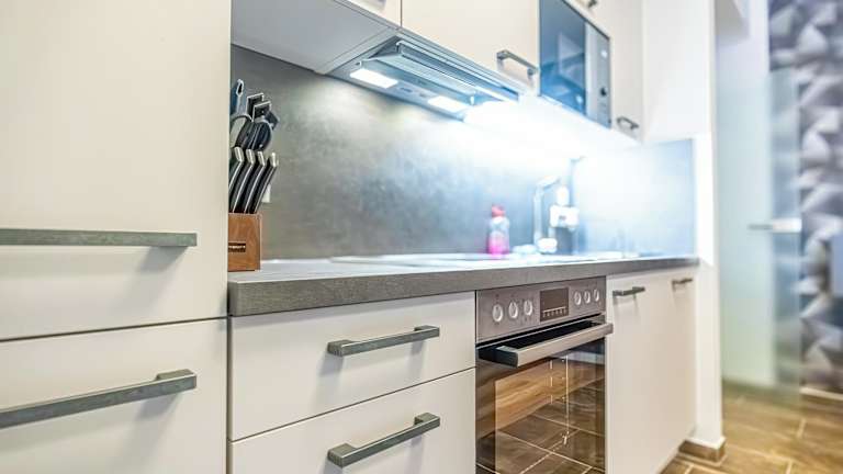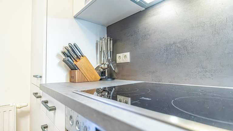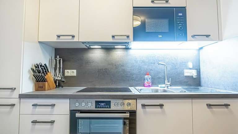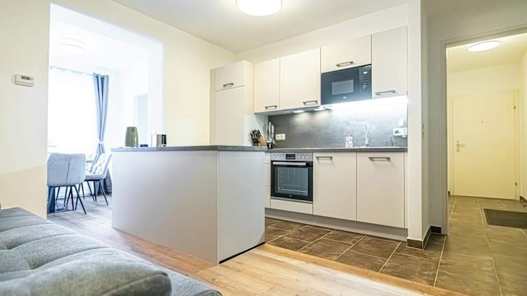 Eine Küche mit Kühlschrank, Ofen, Mikrowelle, Herdplatte, Toaster, Kaffeemaschine und Wasserkocher steht zur Verfügung, was eine Selbstversorgung ermöglicht.