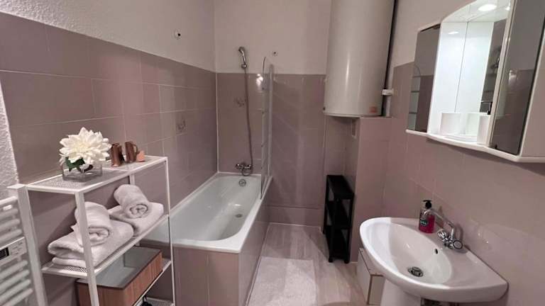 Die Ferienwohnung umfasst ein Schlafzimmer, ein Wohnzimmer sowie eine voll ausgestattete Küche, die mit Kühlschrank und Kaffeemaschine ausgestattet ist. Das Badezimmer bietet eine Badewanne oder Dusche und einen Haartrockner. Handtücher und Bettwäsche werden bereitgestellt.
