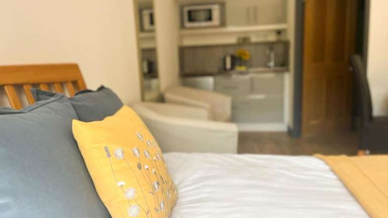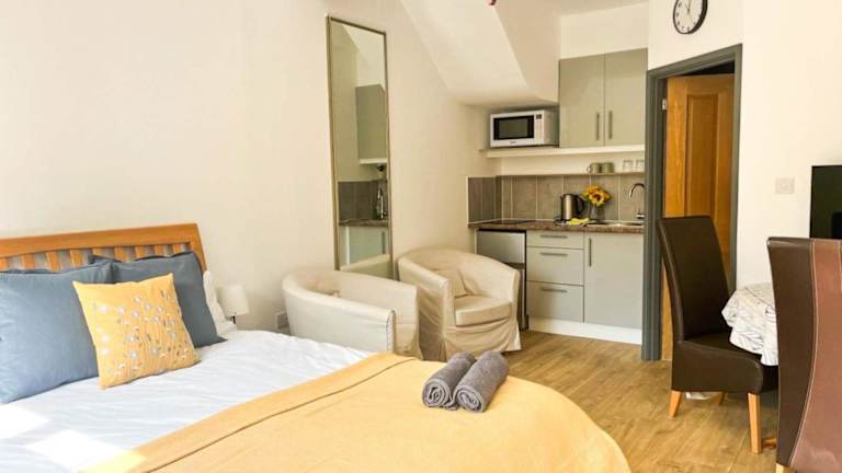 Die Ferienwohnung verfügt über eine Küche, die mit einem Kühlschrank, einer Mikrowelle und einem Wasserkocher ausgestattet ist. Dies ermöglicht die Zubereitung eigener Mahlzeiten.