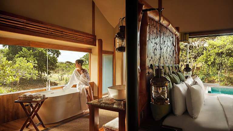 Die Chena Huts bieten luxuriös ausgestattete Villen mit Blick auf die umliegende Wildnis. Jede Villa verfügt über ein geräumiges Wohnzimmer, ein komfortables Schlafzimmer und ein privates Badezimmer mit einer freistehenden Badewanne. Das Highlight jeder Villa ist das private Tauchbecken, in dem Sie sich an heißen Tagen erfrischen können.