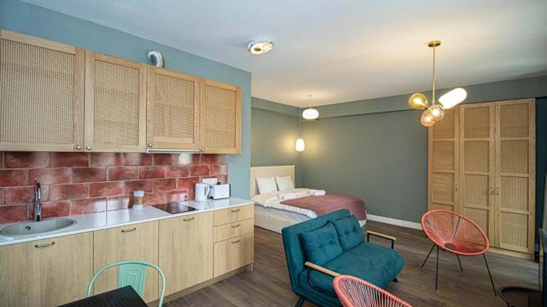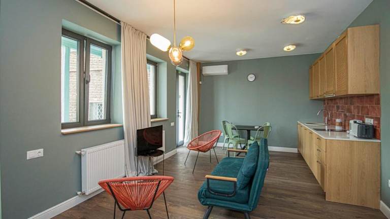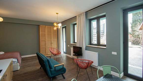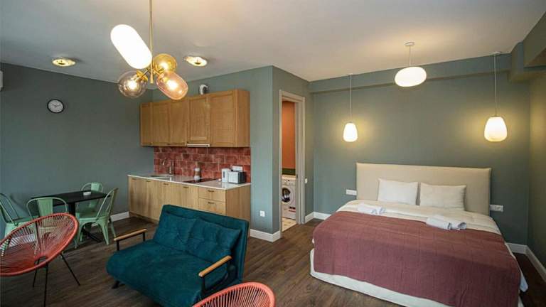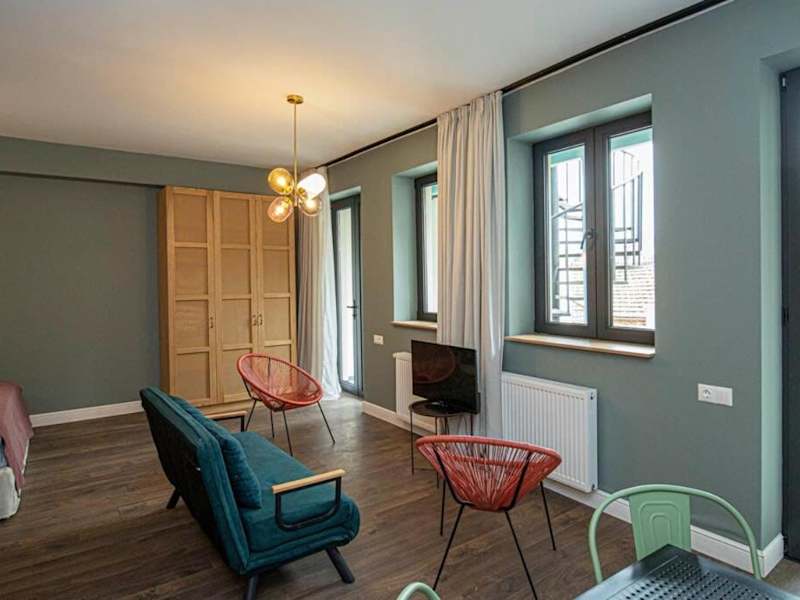 Chic Abanotubani Apt - Prime Location - By Wehost bietet moderne Annehmlichkeiten in einer Ferienwohnung, die mit kostenlosem WLAN und Klimaanlage ausgestattet ist. Die Unterkunft umfasst eine gut ausgestattete Küche sowie einen Wohnbereich mit Fernseher. Die Einrichtung beinhaltet unter anderem eine Veranda oder einen Patio und bietet Zugang zu allgemeinen Haushaltsannehmlichkeiten.