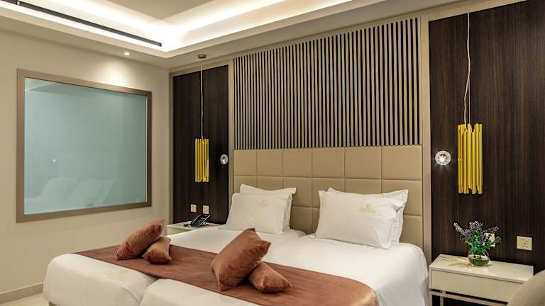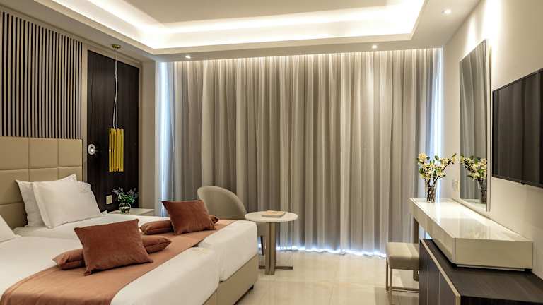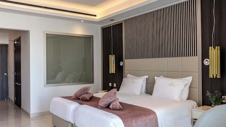 Die Zimmer sind mit modernen Annehmlichkeiten wie Klimaanlage, Balkon oder Terrasse mit Meerblick sowie einem Safe, Minibar, Kühlschrank und Tee-/Kaffeemaschine ausgestattet. Sie verfügen über separate Schlafzimmer und sind mit einem Badezimmer mit Dusche, Badewanne sowie Whirlwanne ausgestattet. Auch Nichtraucher- und Familienzimmer sind verfügbar.