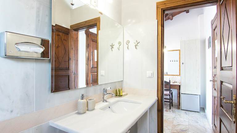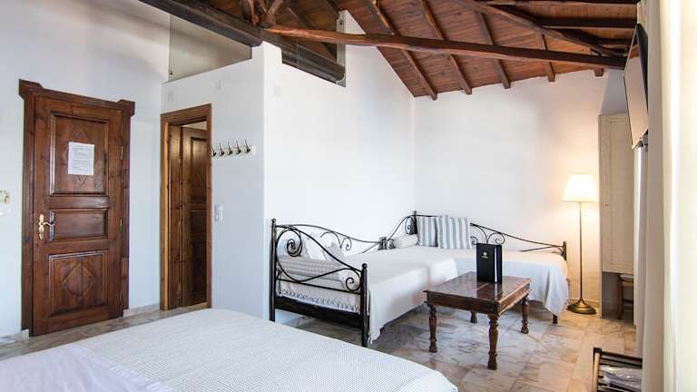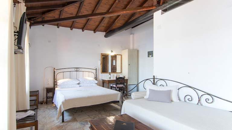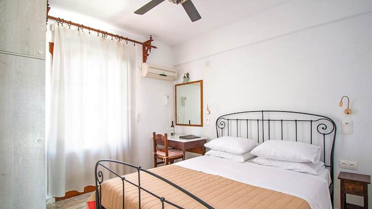 Die Zimmer im Chrysoula's Guest House zeichnen sich durch dunkle Holzmöbel und Holzbalkendecken aus. Zu den Annehmlichkeiten gehören ein TV und ein Kühlschrank. Einige Unterkünfte bieten einen möblierten Balkon mit Blick auf die Ägäis und die benachbarten Inseln. Tägliche Reinigung wird ebenfalls angeboten.