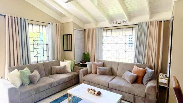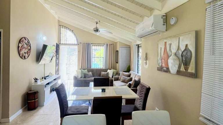 Die Villa verfügt über zwei Schlafzimmer mit Queen-Size-Betten sowie einen Wohnbereich mit einem 55-Zoll-Smart-TV und drei großen Sofas. Es gibt eine voll ausgestattete Küche, eine Smart-Waschmaschine und einen Trockner. Handtücher und Bettwäsche werden bereitgestellt.