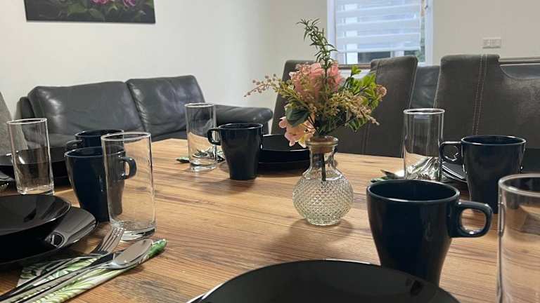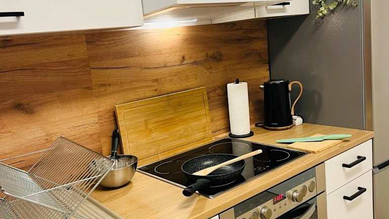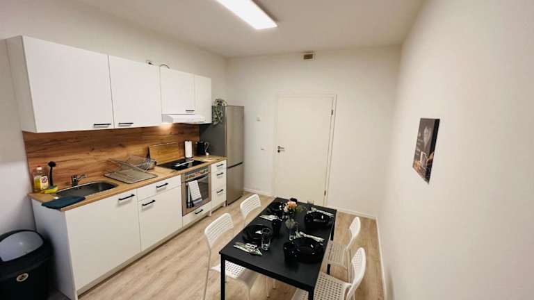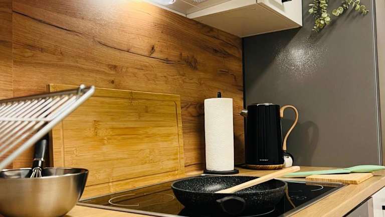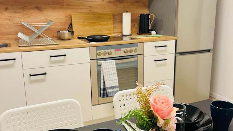 Die Wohneinheiten sind mit einer voll ausgestatteten Küchenzeile ausgestattet, die unter anderem einen Ofen, eine Herdplatte, einen Toaster und einen Wasserkocher umfasst. Ein Esstisch ist ebenfalls vorhanden.