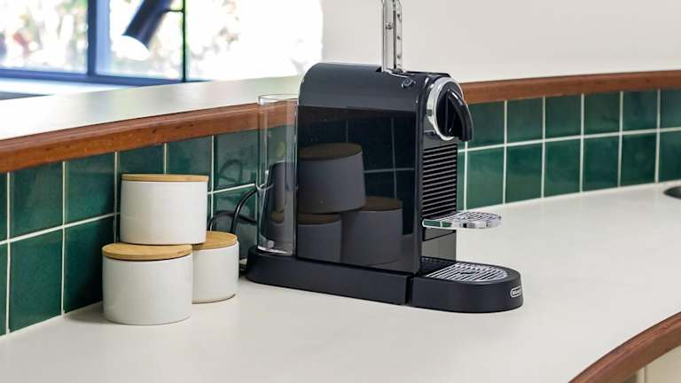 Die Unterkunft ist mit einer voll ausgestatteten Küche ausgestattet, die unter anderem einen Kühlschrank und eine Kaffeemaschine beinhaltet.