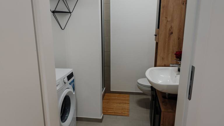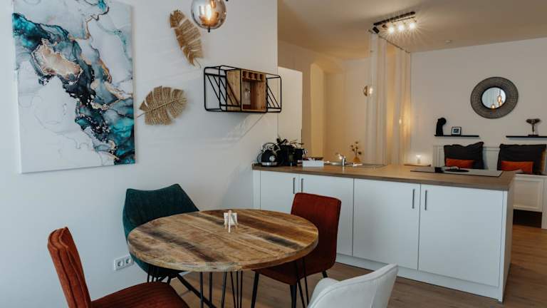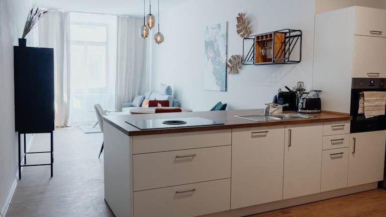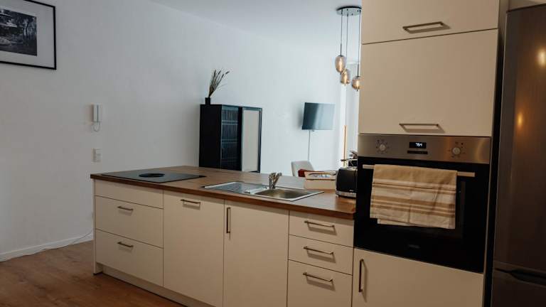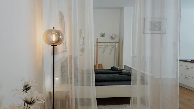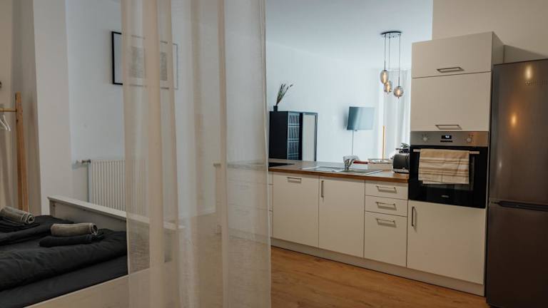 Die Ferienwohnung verfügt über ein Schlafzimmer, ein Wohnzimmer und eine voll ausgestattete Küche mit Kühlschrank und Kaffeemaschine. Ein Badezimmer mit Dusche und Haartrockner ist ebenfalls vorhanden. Handtücher und Bettwäsche werden bereitgestellt. Schallisolierte Zimmer und Nichtraucherzimmer sind vorhanden.