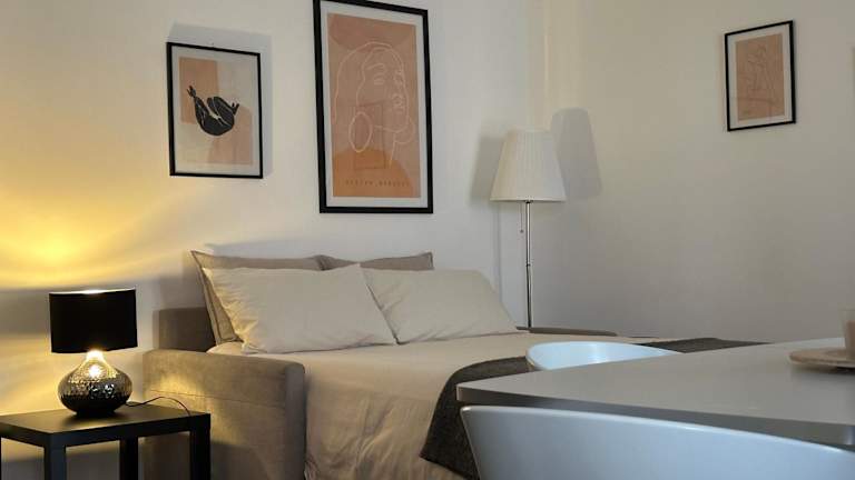 Die Unterkunft umfasst 1 Schlafzimmer, ein Wohnzimmer und ein Badezimmer mit Bidet und Dusche. Handtücher und Bettwäsche werden bereitgestellt.