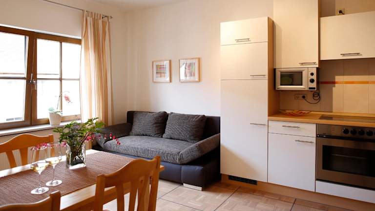 Die Appartements sind mit Parkettböden ausgestattet und bieten eine umfassende Ausstattung, einschließlich einer voll ausgestatteten Küchenzeile mit Kühlschrank, Ofen, Mikrowelle, Kaffeemaschine und Wasserkocher. Der Essbereich und der Flachbild-TV mit Satellitenkanälen sind ebenfalls vorhanden. Jedes Appartement verfügt über ein eigenes Badezimmer mit Dusche und Haartrockner.