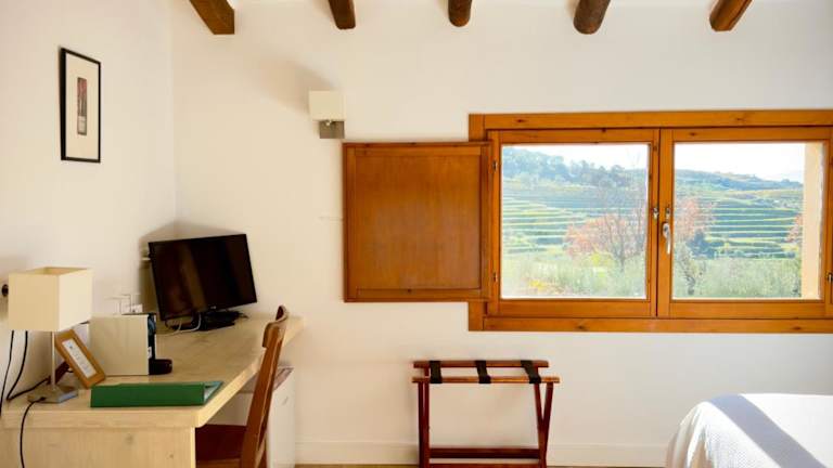 Die Zimmer im Hotel Clos Figueras bieten einen herrlichen Ausblick auf den Garten, die Weinberge und die Berge. Jedes Zimmer verfügt über ein eigenes Bad mit Dusche und Haartrockner. Hier können Sie sich nach einem ereignisreichen Tag entspannen und die Ruhe der Umgebung genießen.