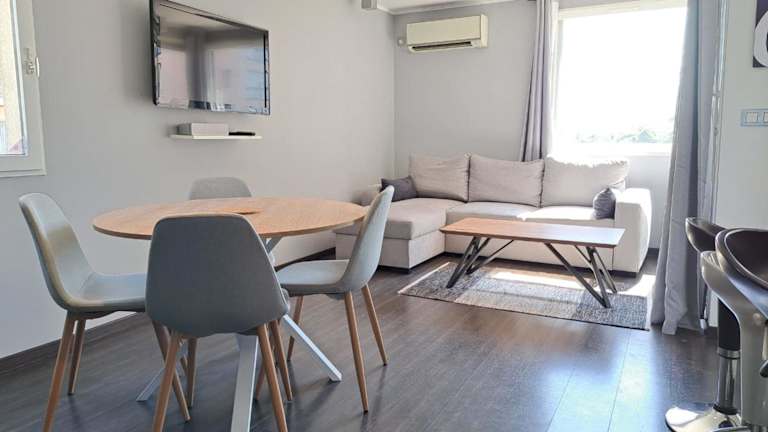 Die Unterkunft umfasst zwei Schlafzimmer, ein Wohnzimmer und eine voll ausgestattete Küche mit Kühlschrank und Kaffeemaschine. Das Badezimmer ist mit einer Dusche und kostenlosen Pflegeprodukten ausgestattet. Zudem ist die Wohnung mit Klimaanlage ausgestattet und bietet eine Terrasse.