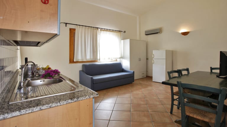 The residence has 55 apartments located in groups of two-storey villas with private entrance, equipped kitchenette, living room with air conditioning, fridge, bathroom with shower, TV. They also have a furnished patio or terrace. All the apartments have an air conditioning into the room or into the living room. They are divided into apartments with 4 beds (BILO 4), living room with sofa bed, kitchenette, and a double bedroom. Or apartments with 6/7 beds (1 in the living room with sofa bed) kitchenette, a double bedroom, a bedroom with bunk beds(TRILO A), or with the option of two bathrooms (TRILO B).