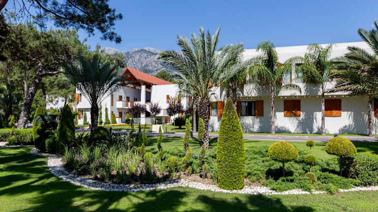 Genießen Sie Ihren Urlaub zwischen den Taurusbergen und dem Mittelmeer, inmitten von Zitronenbäumen. Das Club-Resort liegt direkt an einem ca. 800 m langen Privatstrand. Er besteht aus grauem Sand und am Ufer des Meeres aus einem Gemisch aus Sand, kleinen Steinen und Kiesel. Der Badebereich ist abgegrenzt. Am Strand stehen den Gästen Sonnenschirme, Liegen, Duschen und eine Strandbar zur Verfügung. In den Gärten wachsen vor allem mediterrane Pinien, Palmen, Mimosen sowie viele Bananenstauden, Orangen- und Zitronenbäumen. Zahlreiche Wasserbassins und raffinierte Beleuchtungssysteme zieren die Anlage.