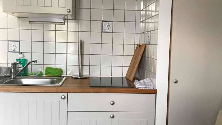 Die Ferienwohnung verfügt über eine Küche, die mit einem Kühlschrank, einem Ofen und einer Mikrowelle ausgestattet ist. Grillmöglichkeiten sind ebenfalls vorhanden.
