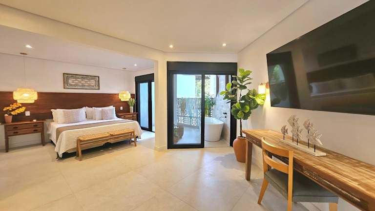 Die Zimmer im Coconut's Maresias Hotel sind praktisch eingerichtet und bieten eine angenehme Atmosphäre. Jedes Zimmer verfügt über einen TV, eine Minibar und ein eigenes Bad. Die klimatisierten Zimmer sorgen für angenehme Temperaturen während des Aufenthalts. Die Unterkünfte befinden sich im zweiten Hotelbereich, auf der anderen Straßenseite der Avenida Francisco Loup.