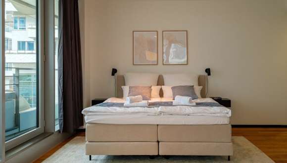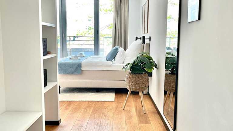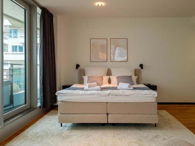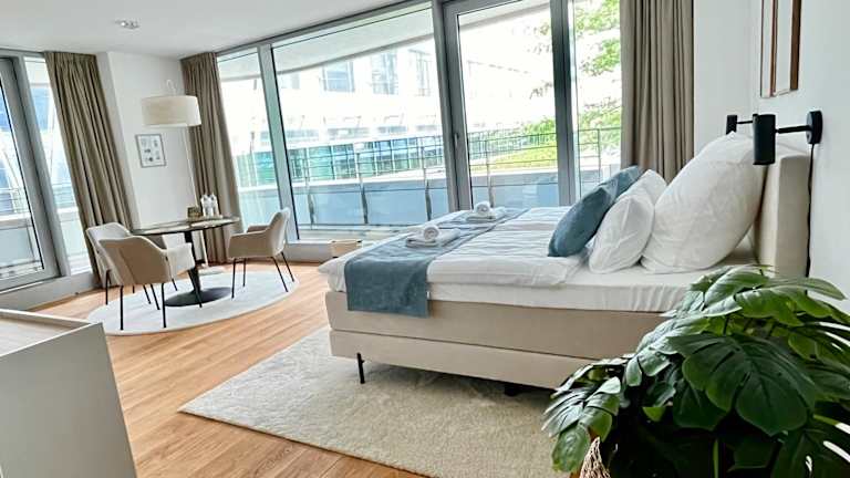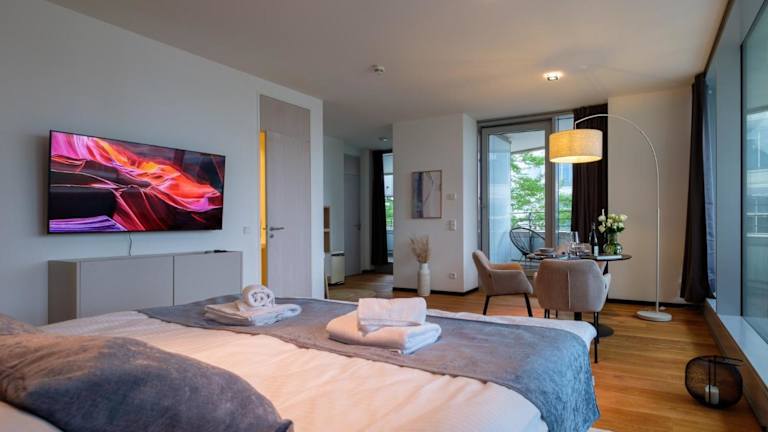 Die Ferienwohnung ist ausgestattet mit 1 Schlafzimmer, 1 Badezimmer, Bettwäsche, Handtüchern, einem Flachbild-TV sowie einem Essbereich. Zusätzlich gibt es eine voll ausgestattete Küchenzeile und einen Balkon mit Blick auf den Fluss.