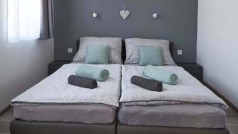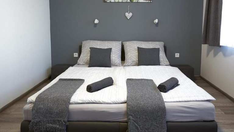 Das klimatisierte Ferienhaus Comfort Ház bietet 2 gemütliche Schlafzimmer, in denen Sie sich nach einem aktiven Tag entspannen können. Das Wohnzimmer ist der perfekte Ort, um sich zurückzulehnen und den Flachbild-Kabel-TV zu genießen. Die Küche ist gut ausgestattet und bietet alles, was Sie für die Zubereitung von Mahlzeiten benötigen. Der Essbereich ist ideal für gemeinsame Mahlzeiten und geselliges Beisammensein. Handtücher und Bettwäsche sind vorhanden, sodass Sie sich um nichts kümmern müssen.
