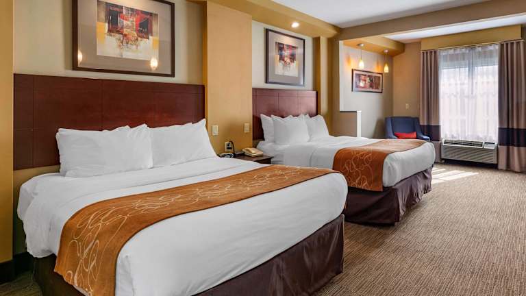 Das Comfort Suites Hotel bietet 53 Nichtraucherzimmer, die über einen Aufzug erreichbar sind. Die Zimmer sind stilvoll gestaltet und verfügen über eine Klimaanlage, ein bequemes Doppelbett, einen Schreibtisch und eine Ausstattung mit einem Kühlschrank, einer Mikrowelle und einer Tee-/Kaffeemaschine. Zur weiteren Ausstattung gehören ein Telefon, ein Sat-TV und kostenfreies WLAN. Die Badezimmer sind mit einer Dusche, einem Haartrockner und kostenlosen Kosmetikartikeln ausgestattet. Rollstuhlgerechte Zimmer mit barrierefreiem Badezimmer sind ebenfalls verfügbar.