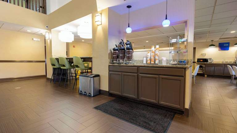 Das Comfort Suites Hotel bietet ein kostenloses warmes Frühstück für seine Gäste. Das Frühstück umfasst eine Vielzahl von Optionen wie Eier, Fleisch, Joghurt, frisches Obst, Müsli und mehr. Es gibt auch eine Auswahl an warmen Waffeln. Für Gäste, die früh abreisen möchten, steht eine Your Suite Success Grab & Go-Tasche zur Verfügung, die 2 Stunden vor dem Frühstück abgeholt werden kann.