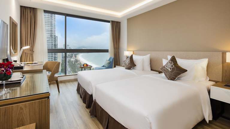 Die Zimmer im Comodo Nha Trang Hotel sind klimatisiert und bieten oft Meerblick. Sie sind mit Teppichböden ausgelegt und verfügen über Doppelbetten, Safes, Minibars und Schreibtische. Auch ein Flachbild-TV sowie kostenloses WLAN sind in den Zimmern vorhanden. Die Badezimmer sind mit Duschen, Badewannen und kostenlosen Pflegeprodukten ausgestattet. Es stehen Nichtraucher- und Familienzimmer zur Verfügung.