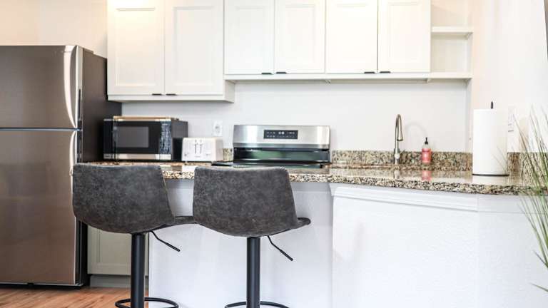 Die Ferienwohnung umfasst 2 Schlafzimmer, eine voll ausgestattete Küche mit Kühlschrank und Geschirrspüler, einen Flachbild-TV, einen Sitzbereich sowie ein Badezimmer mit Dusche.