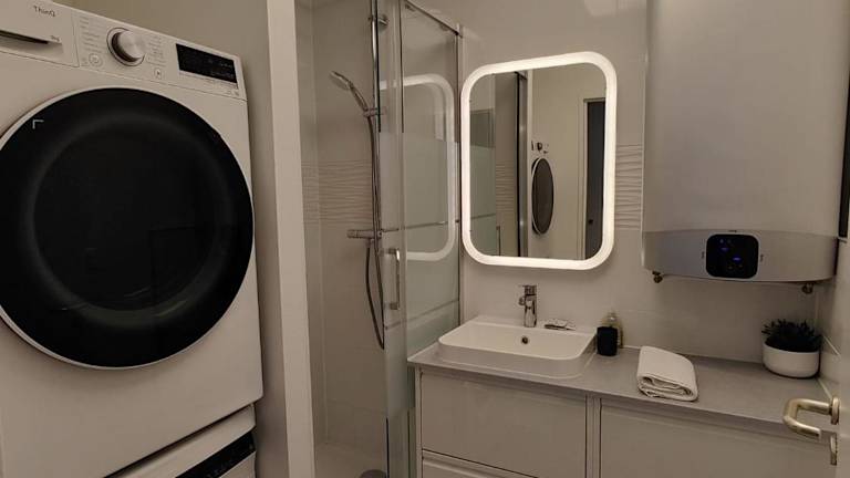 Die Unterkunft verfügt über ein Schlafzimmer, ein Wohnzimmer und eine voll ausgestattete Küche mit Kühlschrank und Kaffeemaschine. Es gibt zwei Badezimmer, die jeweils mit einer Dusche und einem Haartrockner ausgestattet sind. Handtücher und Bettwäsche sind ebenfalls vorhanden.