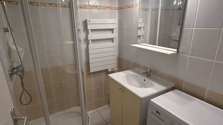 Die Ferienwohnung besteht aus einem Schlafzimmer, einer Küche mit einem Essbereich und einem Badezimmer, das mit einer Dusche ausgestattet ist.