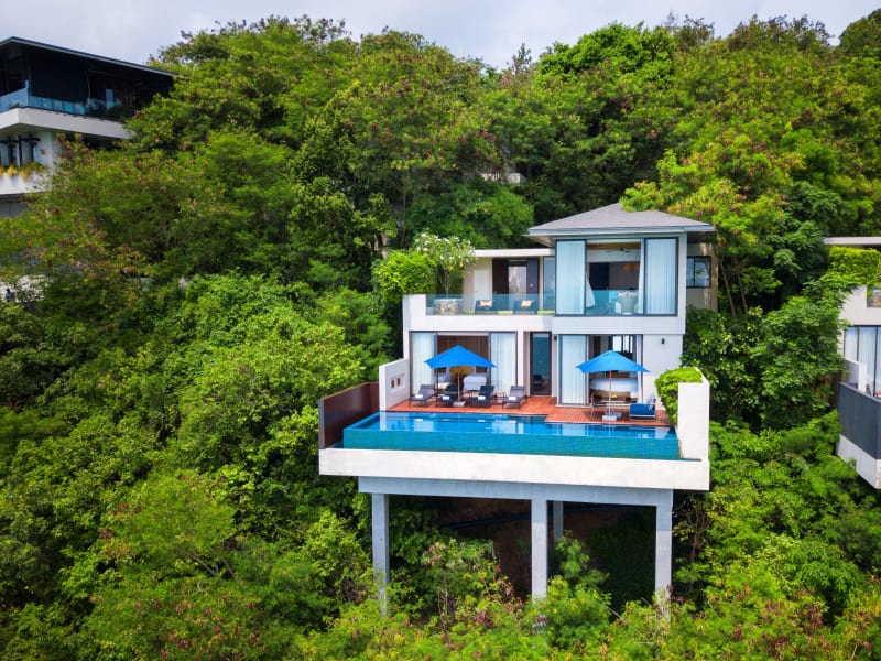 Overlooking the sprawling seascape of the Gulf of Thailand, Conrad Koh Samui Residences offers luxury duplex residences adorning a scenic slope above a private beach in southwestern Ko Samui. Set within 25 acres of virgin jungle, this beautiful hotel in Koh Samui face the luminescent ocean and come with 2 or 3 bedrooms, open-plan living and dining spaces with deluxe wood furnishings and Thai design motifs, kitchenette, private lawn and infinity pool with sundeck, Apple mini-mac and sumptuous bathrooms. Four unique dining venues with stunning gulf panoramas at this Koh Samui hotel offer Thai and Mediterranean cuisine, in-cellar dining and grill classics. The spa encompasses 10 treatment suites with a private deck. There’s an infinity-edge pool, gym and 1,900 ft. of event space.