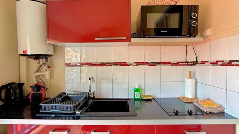 Die Unterkunft verfügt über eine Küche mit Kühlschrank und Mikrowelle, was Selbstverpflegung ermöglicht. Keine Informationen zu weiteren Verpflegungsmöglichkeiten vorhanden.