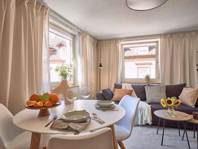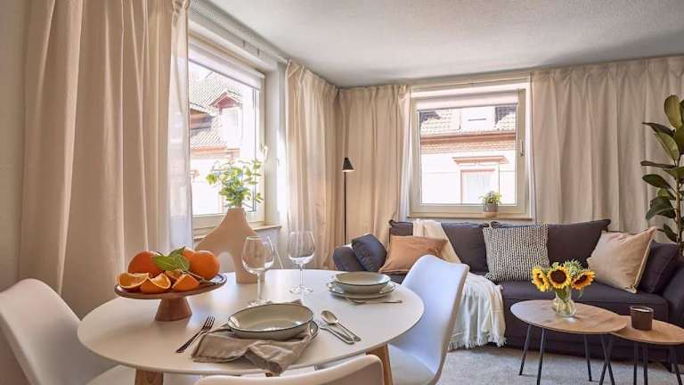 Die Ferienwohnung besteht aus einem Schlafzimmer, einem Wohnzimmer, einer voll ausgestatteten Küche mit Kühlschrank und Kaffeemaschine sowie einem Badezimmer mit Badewanne oder Dusche und Haartrockner. Handtücher und Bettwäsche werden bereitgestellt.