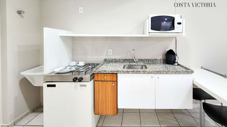 Die Zimmer im Hotel Costa Victória sind mit einer Küche, Kabel-TV und Klimaanlage ausgestattet. Einige Zimmer verfügen zudem über einen separaten Sitzbereich mit Couch und Tisch.