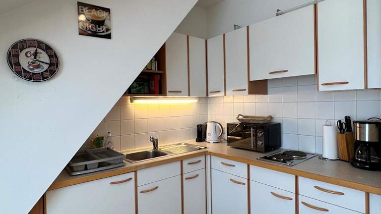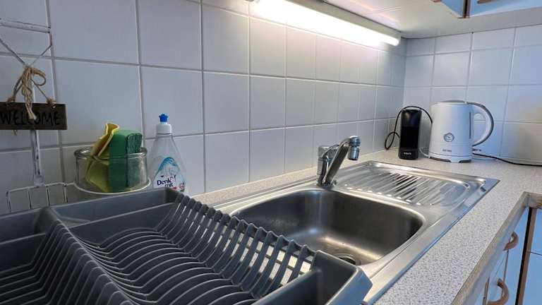 Die Ferienwohnung besteht aus einem Schlafzimmer, einem Wohnzimmer und einer voll ausgestatteten Küche, die mit einem Kühlschrank und einer Kaffeemaschine ausgestattet ist. Das Badezimmer verfügt über eine Badewanne und einen Haartrockner. Handtücher und Bettwäsche werden bereitgestellt.