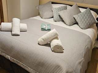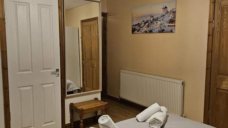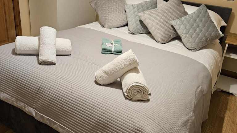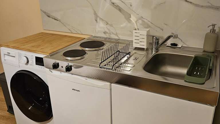 Die Ferienwohnung besteht aus einem Schlafzimmer, einem Wohnzimmer und einer voll ausgestatteten Küche, die einen Kühlschrank und Wasserkocher beinhaltet. Das Badezimmer ist mit einer Badewanne oder Dusche sowie einem Haartrockner ausgestattet. Handtücher und Bettwäsche werden bereitgestellt.