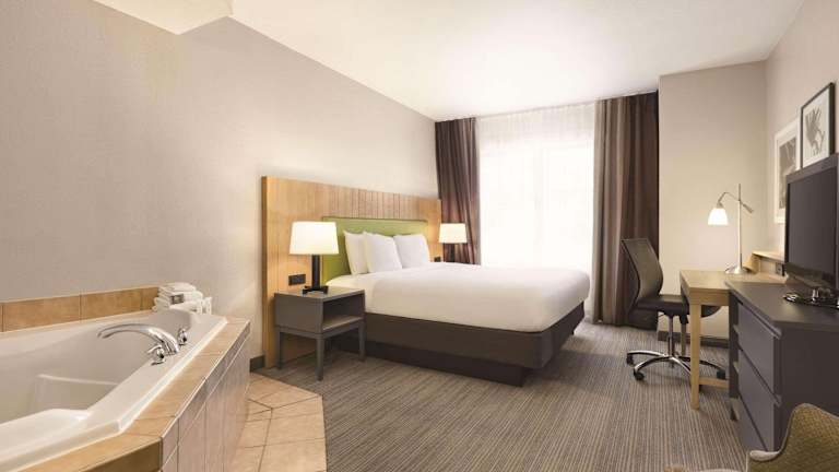 Die Zimmer sind mit einer Klimaanlage und Heizung ausgestattet und verfügen über ein Queensizebett, ein Sofabett sowie ein Badezimmer mit Dusche und Haartrockner. Zur Ausstattung gehören ein Kühlschrank, eine Mikrowelle, eine Tee- und Kaffeezubereiter und ein Schreibtisch. Ein TV-Gerät mit Kabel-TV, ein Telefon und kostenfreies WLAN sind ebenfalls vorhanden. Zudem sind rollstuhlgerechte Zimmer mit barrierefreiem Badezimmer verfügbar.